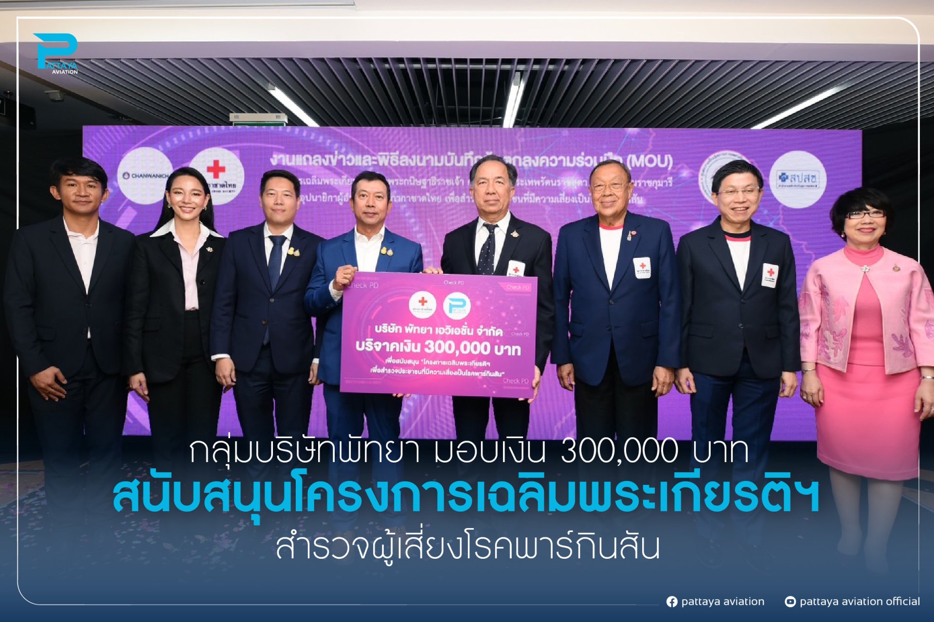 On May 7, 2024, the Pattaya Group, led by Mr. Tosaporn Asunee , Chairman of PATTAYA Group, and Mr. Nat Boonyavichkanont, CEO of PATTAYA Group, donated 300,000 THB through PATTAYA Aviation Co., Ltd. to support the Royal Project in honor of Her Royal Highness Princess Maha Chakri Sirindhorn. The objective of this project is to survey the population at risk of Parkinson's disease.
